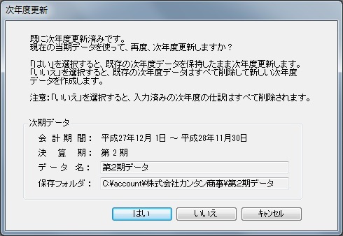 「はい」 を選択すると、既に存在する次期データの仕訳は削除せずに、次年度更新処理を行います。