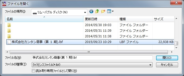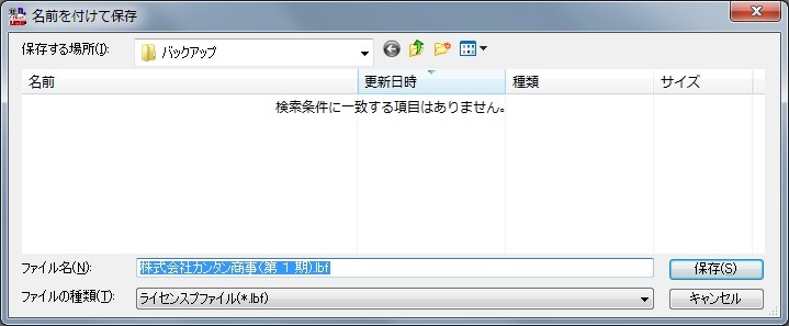 [名前を付けて保存]ダイアログでは、ライセンスファイルの拡張子が、「lbf」になっています。