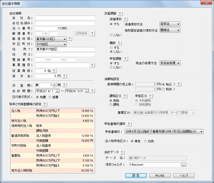 会社情報や決算期、会計期間、決算調整方式、消費税設定などの「税理士いらず」で決算書・申告書を