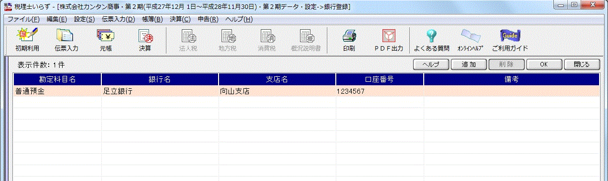 預金通帳と対応する勘定科目名、銀行名、支店名、口座番号を入力して、登録します。