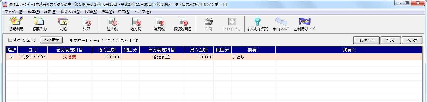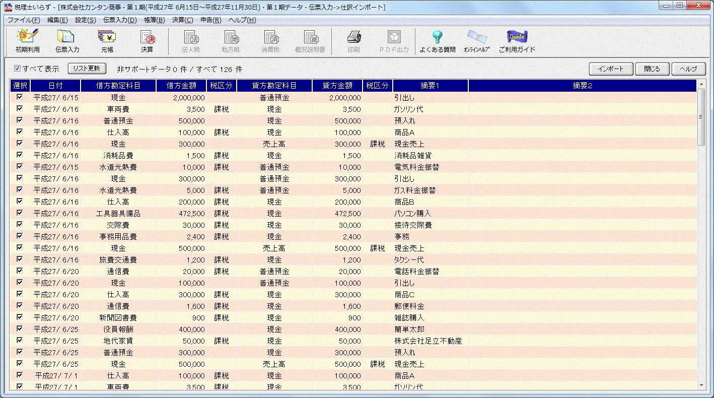 ボタンをクリックすると、インポートした仕訳が「税理士いらず」の内部に取り込まれ、元帳などで