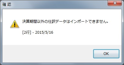 下図のような警告ダイアログが表示され、仕訳インポートは失敗します。