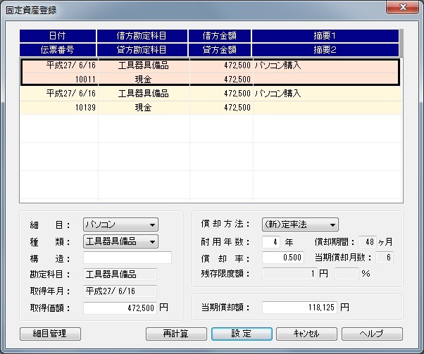 1つの細目に対して、種類、耐用年数、償却率が関連付けられていますので、細目は必ず登録しておく