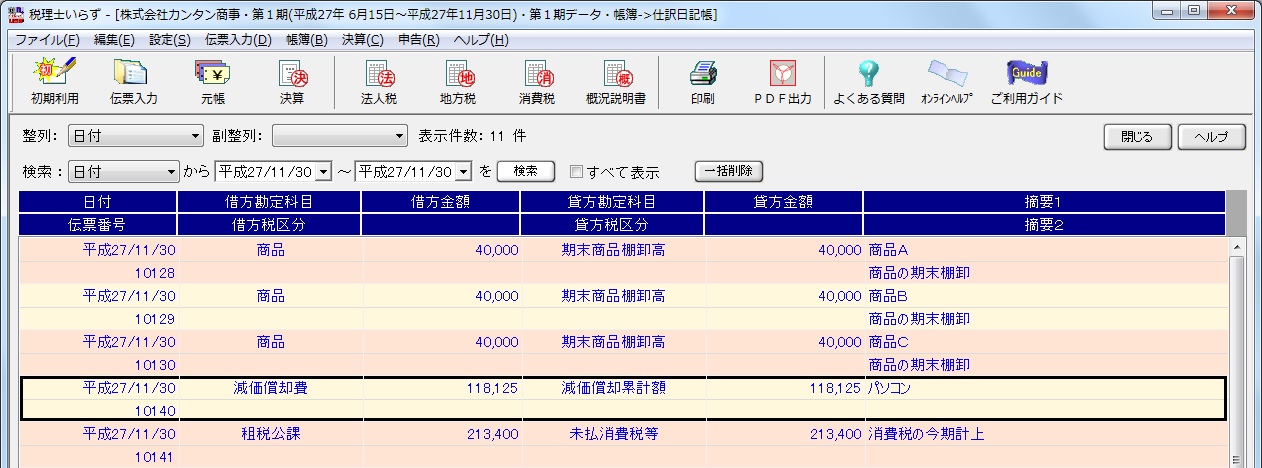 さらに、元帳、仕訳日記帳で、自動生成された減価償却仕訳を確認することができます。
