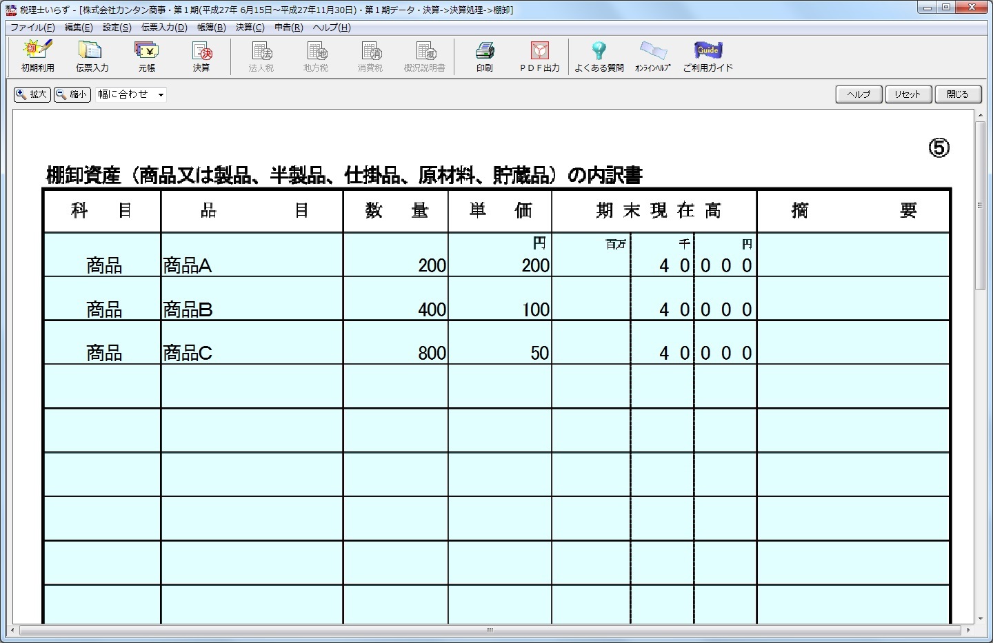 「棚卸」ボタンをクリックすると、下図のように、内訳書Dが表示されます。