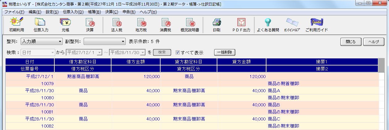 さらに、元帳、仕訳日記帳で、自動生成された棚卸仕訳を確認することができます。